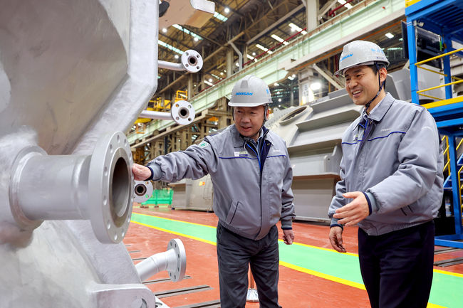 박정원 두산그룹 회장(왼쪽)이 11일, 경남 창원 두산에너빌리티 사업장을 방문해 제작 중인 발전용 가스터빈 제품을 살펴보고 있다.